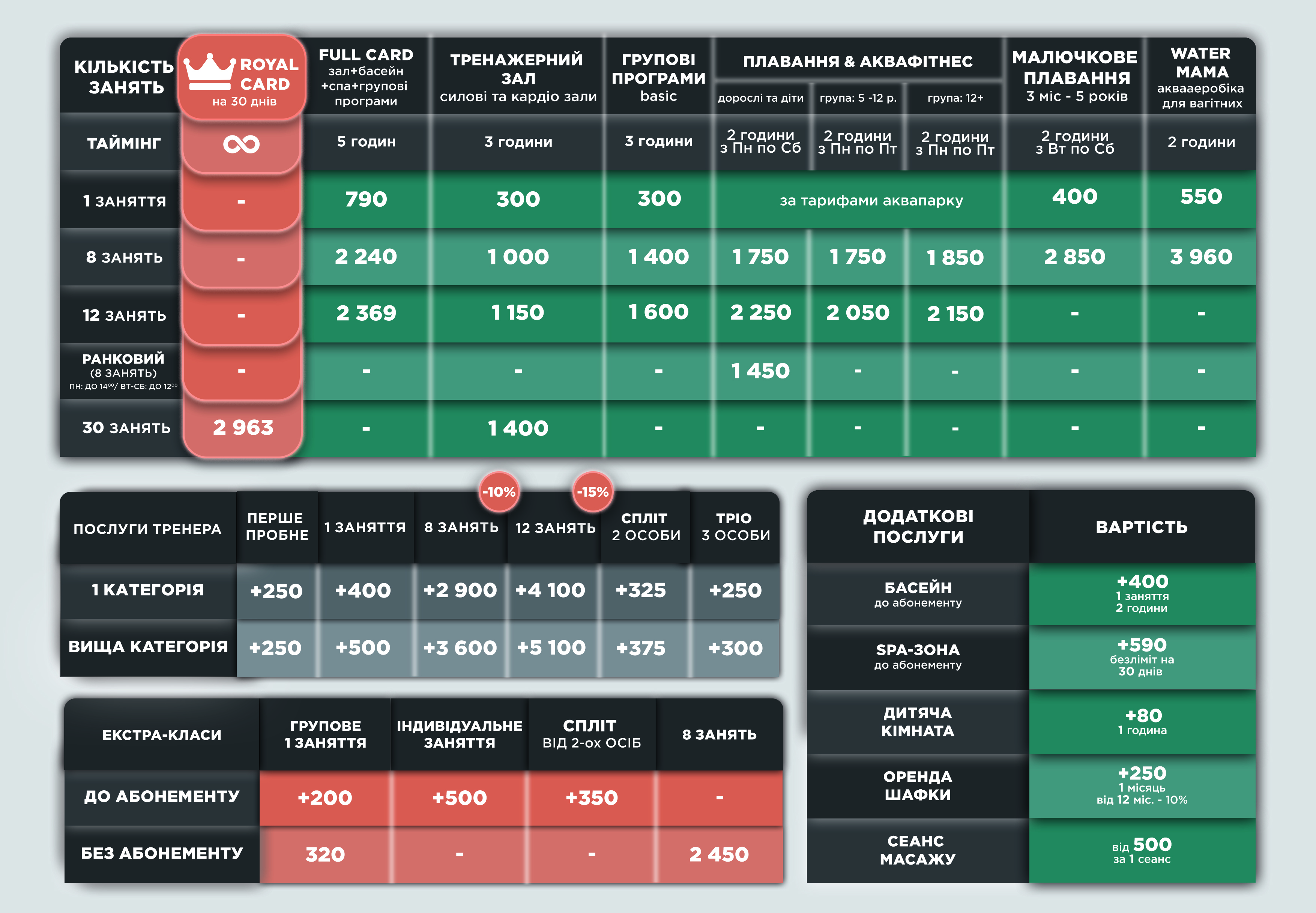 6. Продаж додаткових послуг - Разове заняття в басейні, Абонемент в СПА, Full Body та Персональні тренування здійснюються лише при наявності абонемента Фітнес-Центру